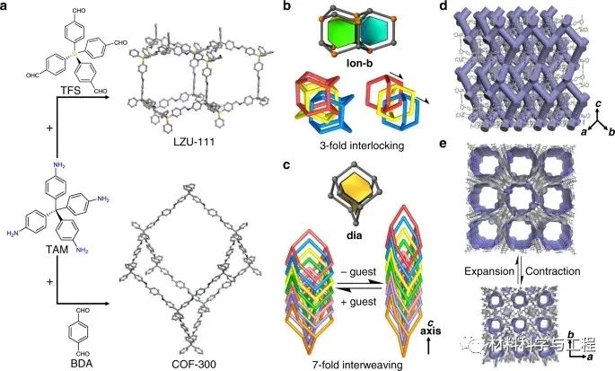 因此,形成了具有1D直線通道的柔性dia-c7 COF-300(圖1e)。通過對特定客體分子的吸附,在這種靈活的滲透模式下,COF-300中易于發生收縮和膨脹結構之間的轉變,因為類金剛籠子可以沿a軸和b軸,均勻地整合而不會相互碰撞。