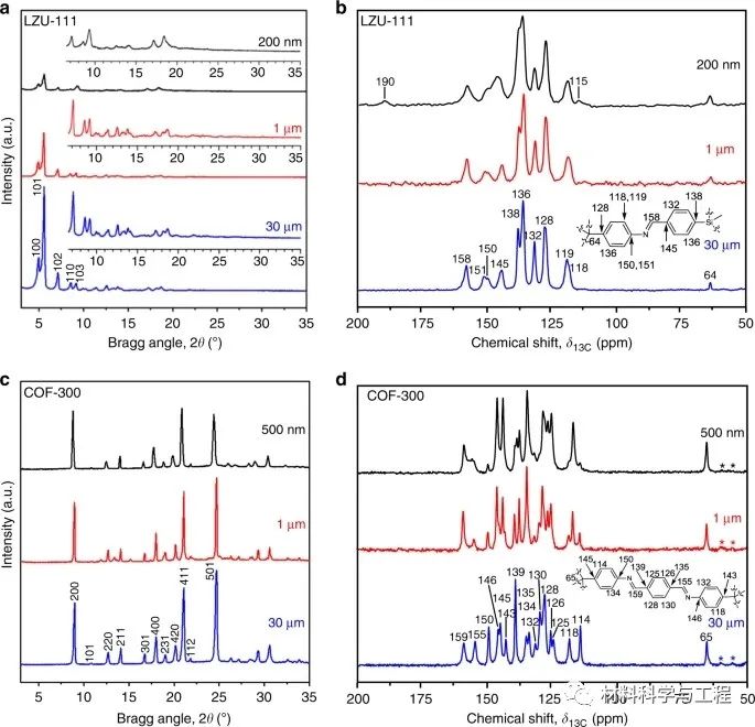 圖3 不同尺寸的LZU-111和COF-300的PXRD和SSNMR (200 nm尺寸的LZU-111和500 nm尺寸的COF-300,黑色;1μm-級別LZU-111和COF-300,紅色;30英寸大小的LZU-111和COF-300,藍色)。