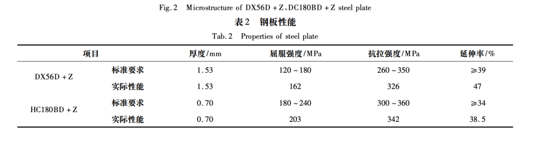 DX56D+Z、HC180BD+Z鋼板金相組織均為鐵素體,如圖2所示,且與已正常鋼板晶粒度基本一致,組織正常,對焊接性能影響無差異。開裂鋼板性能檢測結果見表2,各指標均在標準要求范圍內。