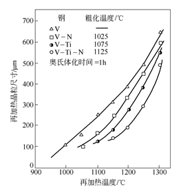 為提高釩微合金化鋼的奧氏體晶粒粗化溫度,通常在鋼中添加0.01%Ti,只要冷卻速度足夠快,如鑄坯的冷卻,將產生細小穩定的TiN粒子,能有效阻止再加熱時高溫奧氏體晶粒的粗化,如圖2所示。由圖可以看出,在釩鋼的基礎上添加0.017%Ti,可顯著提高晶粒粗化溫度。這主要是由于在V-Ti鋼中存在細小而穩定的TiN粒子所致。在V-Ti鋼的基礎上再添加0.012%N,可進一步提高晶粒粗化溫度,這是由于鋼中除存在細小穩定的TiN粒子外,還有大量細小而穩定的VN粒子,鋼中氮含量越高,總的VN粒子體積分數就越大,有效阻止軋制道次間和軋制后奧氏體晶粒的長大,經過再結晶控制軋制工藝后獲得細小奧氏體晶粒,因此在V-N微合金化鋼中添加0.01%Ti是一種優先選擇。添加0.01%Ti-0.01%N的V-Ti-N鋼具有優良的強度、韌性和焊接性能等綜合性能。