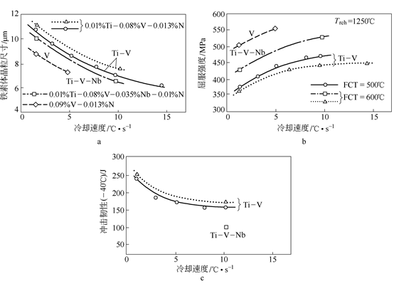 圖5 終軋溫度(1030℃)到終冷溫度(FCT)的冷卻速率對Ti-V(Nb)-N鋼組織和性能的影響