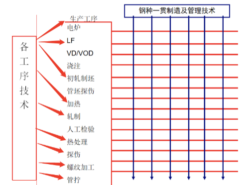 圖一 一貫制造管理與部門(mén)質(zhì)量管理的關(guān)系基于以上解釋,我們可以這樣理解,單純管廠和專業(yè)管廠,一般指的是購(gòu)坯軋制管廠,重在鋼管的制造,其技術(shù)、質(zhì)量投入,多在管材制造、檢驗(yàn)與產(chǎn)品開(kāi)發(fā)上,對(duì)原料的質(zhì)量,只能通過(guò)協(xié)議與驗(yàn)收檢驗(yàn)來(lái)控制。而全流程管廠和一貫制管廠,因都涉及到原料、冶煉、制坯及鋼管制造等工序,在生產(chǎn)裝備及工藝、工序角度是一致的。這類鋼廠,甚至還有其它的板材生產(chǎn)分廠,其技術(shù)和質(zhì)量上的投入上,因需要關(guān)注維度更多,一般都是大型鋼廠。一貫制管廠與普通全流程管廠的區(qū)別,要從質(zhì)量體系上區(qū)分,在生產(chǎn)全過(guò)程的每一個(gè)質(zhì)量控制點(diǎn),由質(zhì)量管理專家或團(tuán)隊(duì),從全局一貫的角度進(jìn)行管理,因此在質(zhì)量均衡性及穩(wěn)定性上,管控得更加精細(xì)些。而缺乏一貫制管理的管廠,其質(zhì)量?jī)?yōu)化與控制,一般只能從本工序角度上著手(可參考圖二),各工序控制的技術(shù)雖可能結(jié)果很好,但從全局上,利益和綜合布局綜合考慮,有時(shí)會(huì)出現(xiàn)按下葫蘆浮起瓢的現(xiàn)象,上工序質(zhì)量有時(shí)會(huì)對(duì)下工序產(chǎn)生嚴(yán)重影響,導(dǎo)致最終質(zhì)量的不穩(wěn)定。