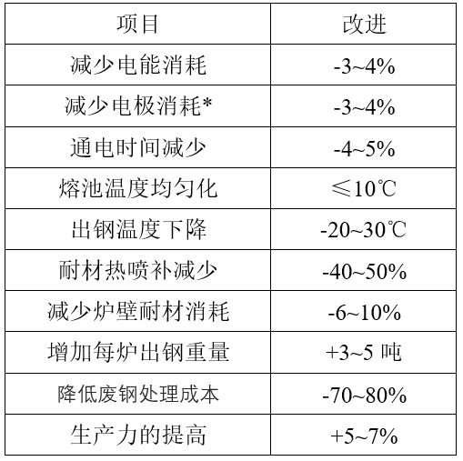 EMS攪拌改善了電爐過程中的傳熱傳質,降低了能量和電極消耗,同時提高了操作的可靠性和安全性。現場工業生產試驗結果表明,使用EMS促進了廢鋼和鉻鐵合金的熔化,有效地降低了爐底結殼的形成。熔池內鋼水溫度更加均勻,目標出鋼溫度控制更精確,使下道VOD的操作更加順暢。短的出鋼時間和穩定的電爐操作也提高了生產率。使用EMS獲得的工藝效益如表2所示。