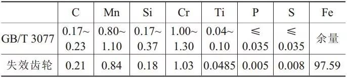 經檢測,失效齒輪的化學成分如表 1 所示,與GB/T3077-1999《合金結構鋼》中20CrMnTi 材料成分進行比對,發現失效齒輪的化學成分達到了要求。