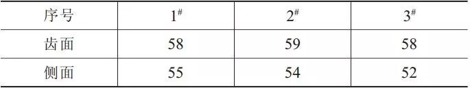 失效齒輪的 表面硬度采用洛氏硬度計進行檢測,檢測位置為齒面及側面,結果見表 3。