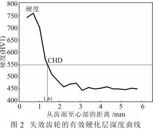 采用顯微硬度計檢測失效齒輪表面滲碳情況,從齒面至心部的硬度變化曲線如圖 2 所示。從圖中可知,失效齒輪的有效硬化層深度 CHD 為 1.41mm,達到了滲碳深度要求[2-3]。圖中,從表面至心部,硬度首先增加,然后平穩降低至 450HV1 左右。
