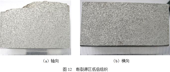 在斷口附近截取了齒軸徑向(距斷口軸向距離約20mm)及軸向樣品,進(jìn)行了低倍組織檢測(cè),結(jié)果如圖10~圖12所示,圖11、圖12試樣上表面為斷口。依據(jù)GB/T 1979—2001標(biāo)準(zhǔn)低倍組織評(píng)定為一般疏松0.5級(jí),無其他低倍組織缺陷。存在較嚴(yán)重枝晶組織,斷裂源區(qū)枝晶組織尤為嚴(yán)重,滲碳淬火層及調(diào)質(zhì)處理層清晰可見,調(diào)質(zhì)層距齒頂深度約為110mm。