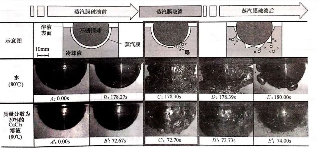 彼得拉什(Petrash ) 研究了 NaCl 和 NaOH 的加入對水的蒸汽膜穩定性的影響。僅僅添加 5% 的 NaCl 幾乎就可使蒸汽膜冷卻階段完全消除,如圖4 a)示。