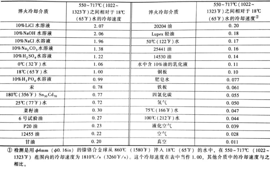 水和不同的鹽溶液與其他介質的相對冷卻速度見表4 。如設想的一樣,在表中所列的各種淬火冷卻介質中,鹽溶液具有最大的相對冷卻速度。而且水溫升高將導致相對冷卻速度逐漸減慢。熱水、空氣和真空是其中冷卻速度最慢的淬火冷卻介質。