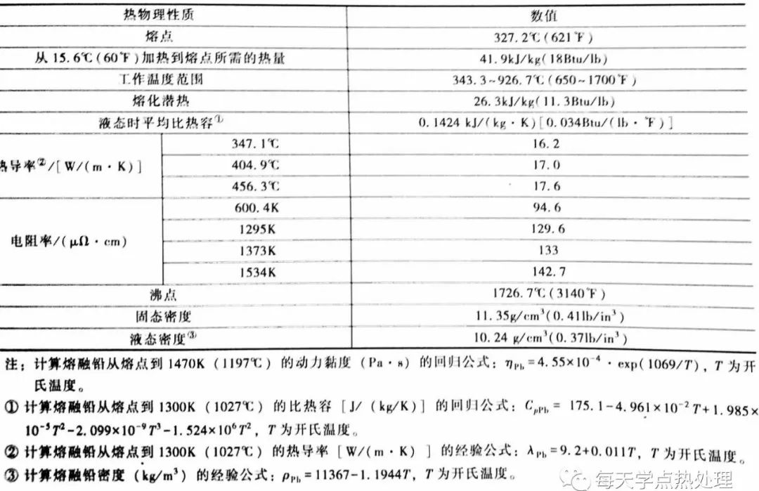 鉛是歷來最常用于做淬火冷卻介質的金屬之一。鉛的熔點是 327℃ (621°F) , 使用范圍一般為343~ 927℃ (649~1701°F) 。低于343℃ (649°F) 時,鉛黏度太大,不能有效地用作淬火冷卻介質。熔融鉛的熱物理性能見表5 。盡管鉛是有毒物質,并且存在清理問題,但其優異的處理效果,仍然被用于鋼絲的派登脫處理(索氏體化淬火)和一些等溫淬火操作中。因為熔融鉛具有高的熱導率,并且沒有膜沸騰冷卻階段,所以在高溫階段具有相當快的冷卻速度,是其他淬火冷卻介質難以企及的。