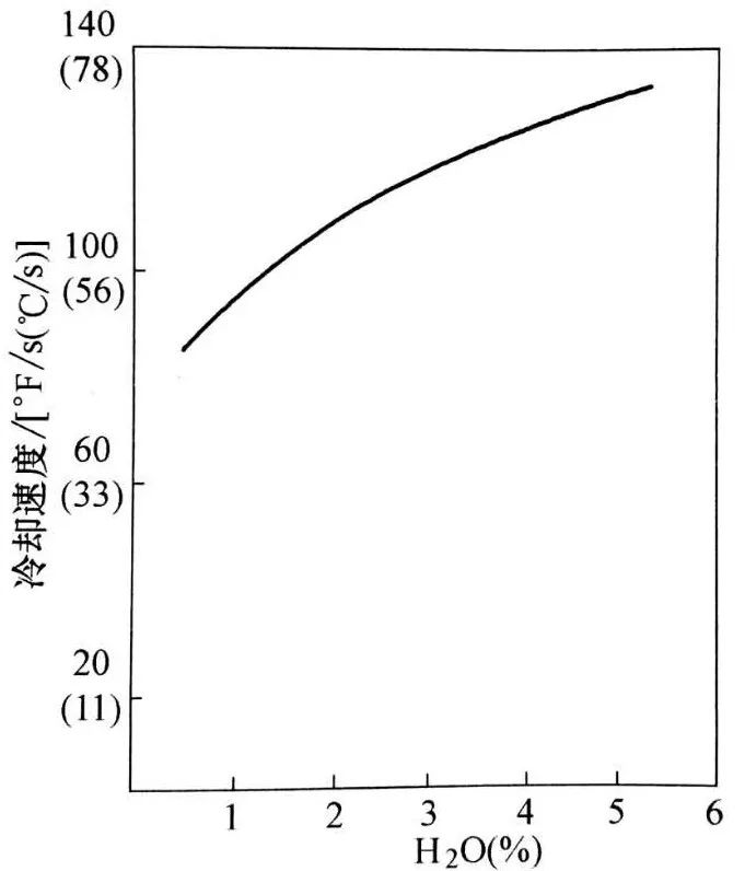 研究中的冷卻速度是650℃ (1200°F) 和260℃ (500℉) 之間的平均值。數據顯示,隨著攪拌速度加快,冷卻速度大幅提高。如之前討論的,含水量從0.5%增加到5%會使冷卻速度提高,如圖14 所示。