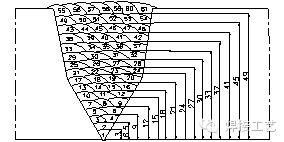 打底層采用氬弧焊的方法焊接,為了保證根部焊道成形和手工電弧焊填充出現(xiàn)燒穿現(xiàn)象,打底焊至少要焊兩層,焊肉厚度至少達(dá)到6mm,采用手工電弧焊填充。焊層布置順序如圖2所示。