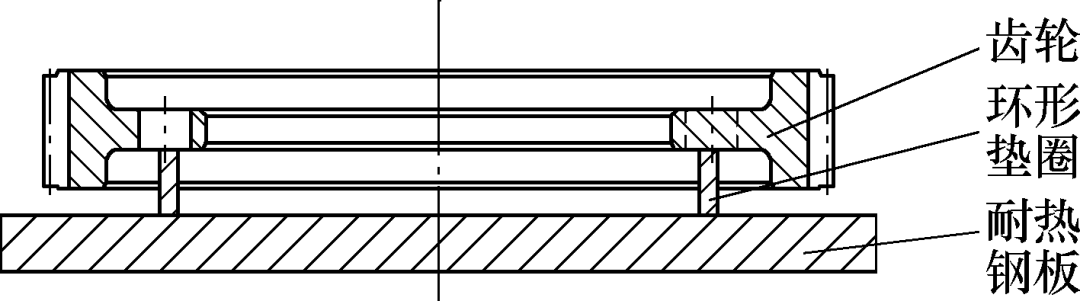 對此,我們設計了一個環形墊圈作為齒輪滲碳專用工裝,環形墊圈簡圖如圖4所示,該工裝加工制作簡單方便,生產成本低。采用另外一種滲碳擺放方式與環形墊圈配合使用,該擺放方式示意圖如圖5所示。