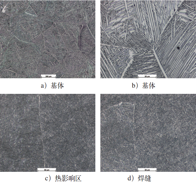 金相組織觀察結果如下:基體為魏氏組織;熱影響區為針狀α+晶間β+部分殘留的晶界α;焊縫為針狀α+晶間β+極少量殘留的晶界α,金相組織形貌如圖4所示。