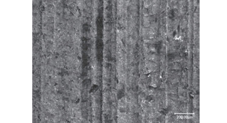 用超景深數碼顯微鏡分別觀察軸承內圈輪齒、軸承套圈滾道以及軸承滾子的表面形貌,其中輪齒表面形貌如圖3所示。圖中的豎直條紋為機加工形成的表面磨痕,齒輪運行過程因接觸疲勞產生了細小的點蝕坑。