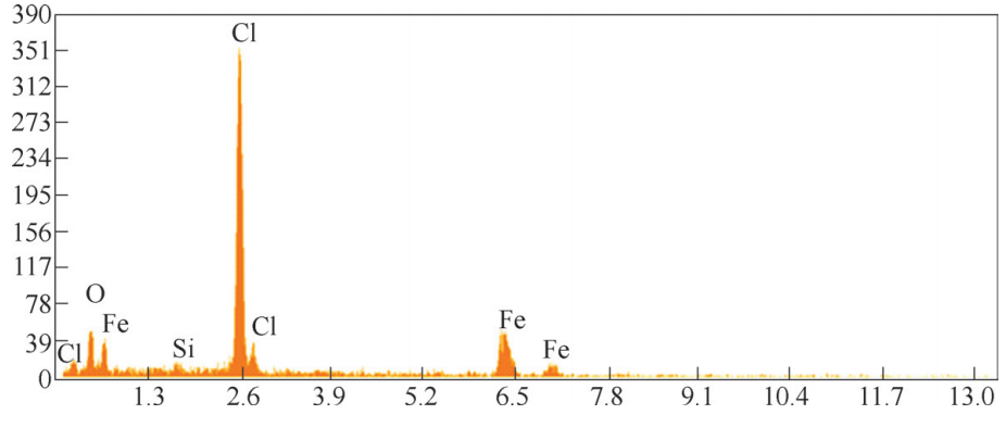 利用能譜儀分析不銹鋼管斷口表面的腐蝕產(chǎn)物,圖5為能譜分析結(jié)果。從衍射峰譜圖上可以直觀地看出,氯含量很高,說明該不銹鋼管處于含氯的腐蝕環(huán)境中。該化肥廠開裂失效鋼管置于露天環(huán)境,廠址地處沿海地帶,距海岸僅1.1km,屬于典型的海洋大氣環(huán)境。在溫度濕度較高時,大量海水蒸發(fā)產(chǎn)生鹽霧現(xiàn)象,致使空氣中含有較高的氯離子,含有氯離子的水分吸附到不銹鋼管的外壁,形成腐蝕性介質(zhì),對不銹鋼管不斷腐蝕。奧氏體不銹鋼在普通大氣環(huán)境中,表面會形成致密的鈍化膜(氧化膜),此鈍化膜隔絕了大氣與不銹鋼表面直接接觸,對不銹鋼具有保護(hù)作用,使其具有優(yōu)良的耐腐蝕性能。即使鈍化膜被破壞,也會及時再生、修復(fù)。而氯離子極容易破壞奧氏體不銹鋼的鈍化膜,在表面形成點(diǎn)蝕或蝕坑,加速不銹鋼的腐蝕。