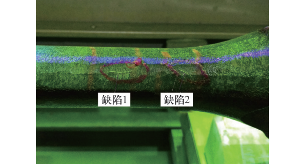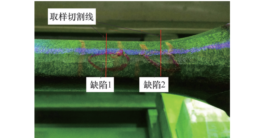 對杠桿桿身進行磁粉檢測,試樣表面存在兩條線性缺陷磁痕,缺陷1、2均為縱向并呈曲線狀,周圍沒有分支磁痕,長度分別為30mm和25mm,如圖2所示。