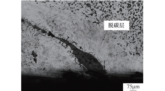 缺陷2微觀形貌如圖6所示,與缺陷1金相組織特征基本一致,缺陷以裂紋形式呈45°夾角向內部延伸,并在延伸一段后轉彎向表面擴展。裂紋起始端裂紋開口較大,兩側有大塊鐵素體,裂紋周圍有嚴重的氧化脫碳現象且尾端圓禿,與金屬流線方向一致,如圖7所示。經測量,裂紋深度在0.1~1.8mm,脫碳層深度在0.15~0.28mm。裂紋中部以縱向線性向內部延展,兩側較平滑,裂紋周圍有脫碳現象,裂紋內有非金屬夾雜物灰色物質。裂紋根部以斷續非金屬夾雜物線狀擴展,脫碳層不明顯,沒有裂紋分叉等現象。