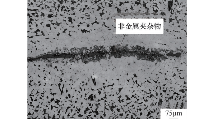 對杠桿桿身的線性缺陷1、2位置分別橫向切割取樣進行金相組織檢驗,取樣部位如圖3所示。缺陷1微觀形貌如圖4所示,缺陷以裂紋形式呈15°夾角向內部延伸,并在延伸一段距離后轉彎與表面平行方向擴展。觀察發現,裂紋前半部分周圍組織珠光體稀少,鐵素體相對較多,裂紋周圍有氧化脫碳現象,裂紋內充斥非金屬夾雜物,如圖5所示。經測量,裂紋深度在0.1~0.7mm,脫碳層深度在0.11~0.18mm。裂紋根部以斷續非金屬夾雜物線狀擴展,脫碳層較少。