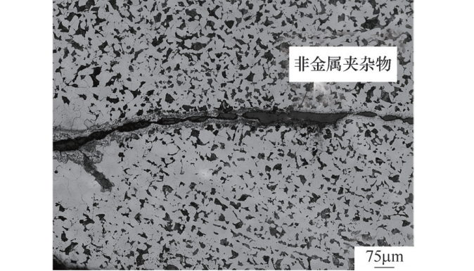 鍛造折疊裂紋缺陷是指在鍛造過程中金屬流動不合理導致鍛件表面形成重疊層,是鍛造加工過程中最常見的缺陷。杠桿鍛造折疊的形成可能是由于表面氧化皮或非金屬夾雜物在鍛打時被壓入鋼體內,或是鍛造拔長時速度過快造成的。若折疊很淺且在加工面,則可通過切削加工加以消除;若折疊很深且在非加工面上,那么它對零件性能的影響是嚴重的,是一種不允許的鍛造缺陷。建議改進桿件的模鍛工藝,定期清理鍛造設備表面毛刺和氧化皮,加強對杠桿表面夾雜物的檢測,以及鍛造時合理控制拔長速度,均為預防折疊缺陷的有效手段。