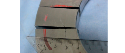 通過宏觀觀察,可以發現裂紋均位于零件背面接近中孔附近,多數裂紋長度40mm左右,形態均略呈弧形,多個廢品上裂紋缺陷的形態大體相近,個別零件上折疊痕跡明顯。裂紋位置如果對應鍛造前料段上,應為料段內部某橫截面,原料棒材整支經過超聲波檢測,幾乎可排除這個位置存在裂紋的可能性。