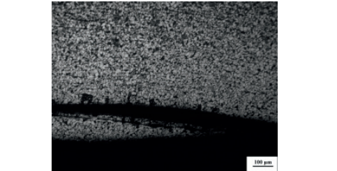如圖3所示,在零件裂紋缺陷位置取樣,在垂直裂紋方向上進行磨拋制樣,在光學顯微鏡下由外側開始,沿裂紋延伸痕跡逐步觀察裂紋形貌。裂紋始端開口明顯,呈微小角度逐漸向內擴展,總體呈掀起狀,末端逐漸無開口,呈毛細狀延伸,放大后可見裂紋內存在明顯氧化現象,如圖7~圖12所示;腐蝕后(4%硝酸酒精溶液),組織為正常鐵素體珠光體組織,有輕微脫碳;鍛造變形產生的金屬流線痕跡清晰可見,裂紋的擴展方向整體與該流線平行。