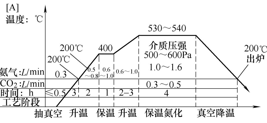 當爐溫到530℃時,進入恒溫保溫氮化階段,通氨氣1.0~1.6L/min、二氧化碳0.3L/min,調整通氨量、真空泵抽氣速度,使介質壓力達500~600 Pa,保溫4h。