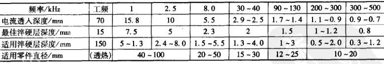 (1) 頻率選擇。感應加熱所需電流頻率,取決于產品零件對淬硬層深度的要求。表6為感應加熱電流透入深度與淬硬層深度的合理頻率范圍。