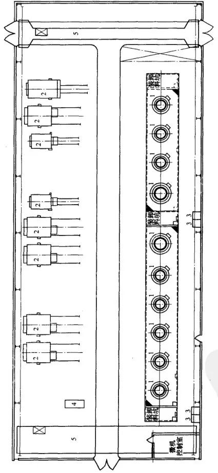 (2) 拖拉機零件熱處理車間工藝平面布置如圖2所示。(3) 重型柴油機廠部件熱處理車間工藝平面布置如圖3所示。(4) 重型柴油機廠大件熱處理車間工藝平面布置如圖4所示。(5) 工程機械可控氣氛熱處理車間工藝平面布置如圖5所示。