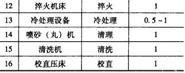 集油槽的容積(m3) : V2= (V1 +全車間循環淬火油槽總容積)×1.2 (3) 清洗設備。清洗設備有連續式、室式、槽式等清洗機和清洗槽。多數清洗機是與加熱淬火設備配套使用的,作前清洗或后清洗用。應根據多數熱處理件的批量和加熱淬火爐的操作方式選擇。(4) 清理及強化設備。清理及強化設備主要用于清理零件熱處理后表面的氧化皮或進行表面強化用。該設備(如噴丸機、酸洗槽、清理滾筒)多有粉塵、酸氣、噪聲等污染環境物,因此,多數獨立設置。可按處理量計算所需的設備量。(5) 校直設備。熱處理后的彎曲工件需要用手動或機械校直。小型零件用手動螺旋壓床或齒條壓床,中型、大型零件用液壓機。一般零件所需校直機的參數見表13。