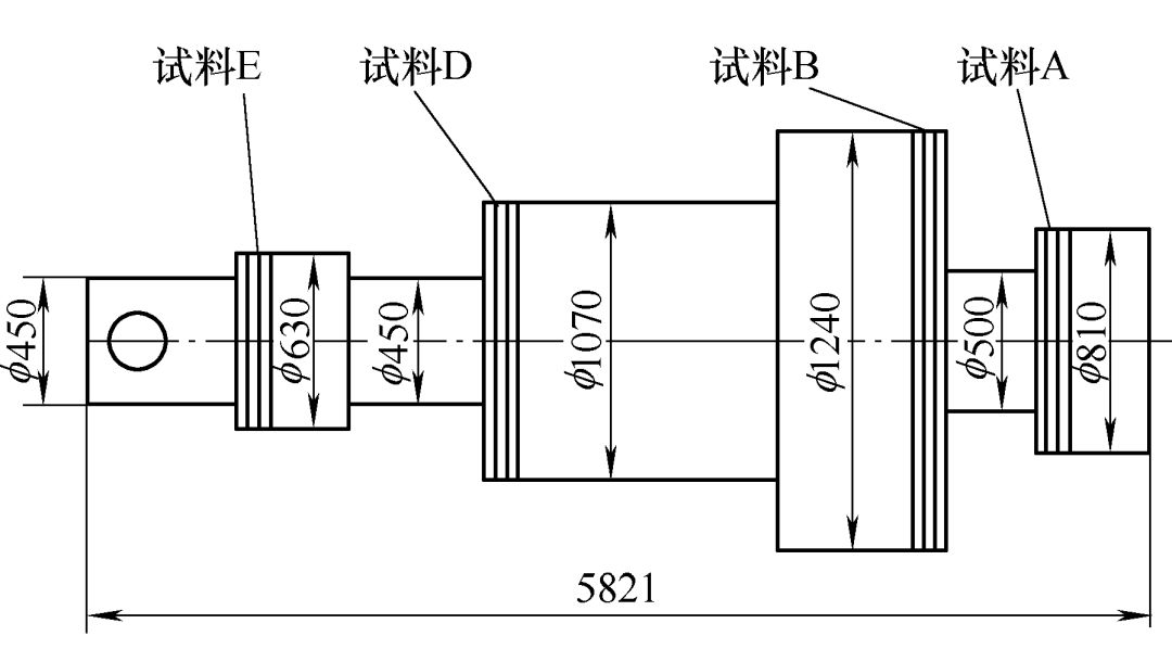 我公司為國內(nèi)某廠生產(chǎn)的汽輪機(jī)高中壓轉(zhuǎn)子鍛件(尺寸輪廓見圖1)就是選用此材質(zhì),其制造及驗(yàn)收標(biāo)準(zhǔn)采用的是法國阿爾斯通標(biāo)準(zhǔn)。該標(biāo)準(zhǔn)與國內(nèi)同類產(chǎn)品標(biāo)準(zhǔn)和美國西屋標(biāo)準(zhǔn)相比較,除了同樣要求獲得所需的高溫性能外,還要求得到較高的沖擊韌性和較低的脆性轉(zhuǎn)變溫度。阿爾斯通、西屋和JB/T93標(biāo)準(zhǔn)的性能要求如表2所示。