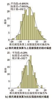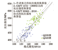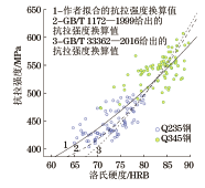 由硬度推算抗拉強度,目前可以依據的國內標準主要有GB/T 33362—2016《金屬材料 硬度值的換算》和GB/T 1172—1999《黑色金屬硬度及強度換算值》。GB/T 33362—2016使用翻譯法等同采用ISO 18265:2013《金屬材料 硬度值換算》(英文版),該標準中表A.1給出的非合金鋼、低合金鋼與鑄鋼硬度換算表,是由德國冶金工程師協會在多個不同試驗室中使用經檢驗和校準的硬度計進行比對試驗得出的。GB/T 1172—1999是由中國計量科學研究院等多家研究機構經過大量試驗研究得出的,標準中的表2給出了主要適用于低碳鋼的換算關系。但這兩個標準都沒有給出換算值不確定度的具有統計意義的可靠數據,對于換算結果的偏差范圍無從得知。