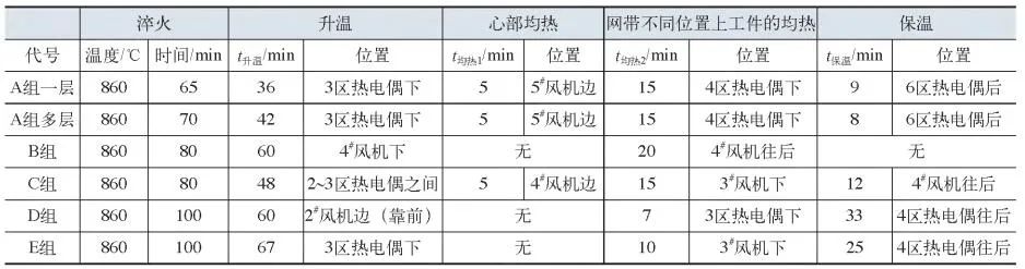 A1層主要是測試工件在爐內的升溫過程,其他各組都是以爐子的額定產能進料,平鋪在淬火網帶上,以保證測試環境的一致性。5組測試分別按字母A?E進行標記。每種爐子上都測一遍,具體測試分組見表1。