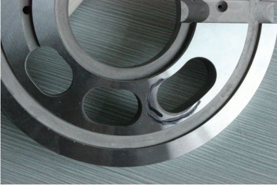 某批零件在磨削工序出現裂紋、崩邊脫落現象,如圖2所示,問題零件共200余件,缺陷均集中在配油盤的平面側,球面側未發現類似問題。針對這一問題,進行理化檢驗分析,以找出具體原因。