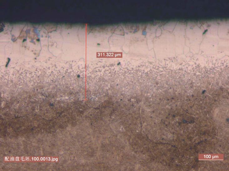 該工件表面預留加工余量約1.2mm,從理論上來說0.31mm的脫碳層是完全可以去除的,按廠內檢驗標準脫碳層深度不得超過成品加工余量的1/3,該調質態毛坯的脫碳層深是合格的。