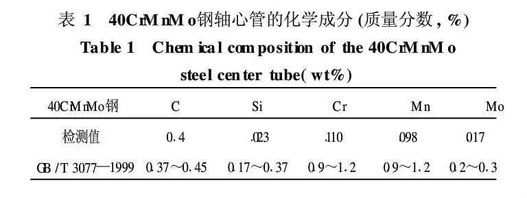 這就要求井下開采工具材料性能具有優(yōu)良的綜合力學性能, 既要保證高的強度,也要保證優(yōu)良的沖擊韌性,同時還要耐海水、泥漿的腐蝕。鑒于井下工況對于具使用性能要求,井下工具選材通常情況是含有耐腐蝕元素Cr、Mo等的合金結(jié)構(gòu)鋼,然后通過適當熱處理調(diào)質(zhì)工藝來保證其滿足強度和沖擊韌性要求。本文針對井下管柱加工過程中,對其中的一種材質(zhì)為40CrMnMo鋼的軸心管工件進行調(diào)質(zhì)處理時,在淬火過程中多次出現(xiàn)嚴重開裂,導(dǎo)致工件報廢,造成定經(jīng)濟損失。為此,從軸心管材質(zhì)化學成分、組織、熱處理工藝以及裂紋形態(tài)等方面分析了產(chǎn)生淬火裂紋原因,提出了改進和預(yù)防措施。