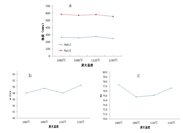 對熱軋后鋼板在1060℃、1090℃、1120℃、1150℃等不同溫度下保溫30min進(jìn)行固溶處理,固溶處理后的性能試驗結(jié)果如圖5所示。從圖中看出,隨著固溶處理溫度的變化,904L性能發(fā)生一定變化,屈服強度和抗拉強度呈現(xiàn)一定的下降,但變化不是很明顯,延伸率呈現(xiàn)一定的上升,硬度呈現(xiàn)先下降后上升趨勢,但均滿足GB/T4237-2012標(biāo)準(zhǔn)之相關(guān)規(guī)定,綜合試驗性能來看,在1150℃退火后表現(xiàn)出綜合的力學(xué)性能。