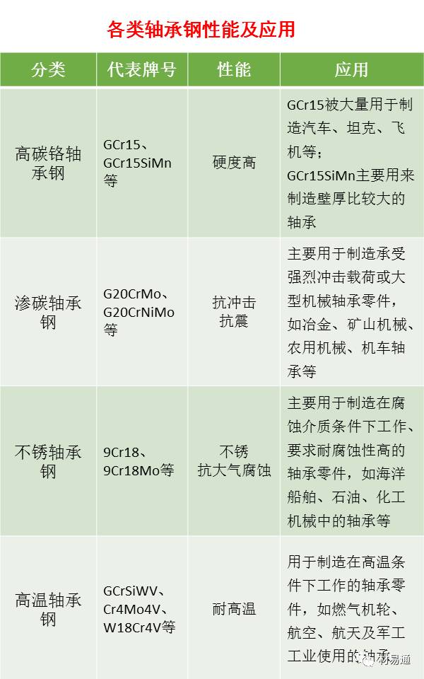 軸承鋼是用于制造滾動軸承的滾動體和內外套圈的鋼,通常在淬火狀態下使用。滾動軸承在工作中需承受很高的交變載荷,滾動體與內外圈之間的接觸應力大,同時又工作在潤滑劑介質中。因此,滾動軸承鋼具有高的抗壓強度和抗疲勞強度,有一定的韌性、塑性、耐磨性和耐蝕性,鋼的內部組織成分均勻,熱處理后有良好的尺寸穩定性。