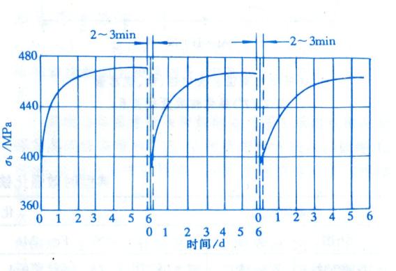 將經過低溫時效強化的某些合金在較高溫度下(高于先期時效溫度但低于固溶線溫度)短時加熱并迅速冷卻,其強度和其他性能回復到新淬火狀態的現象。為此目的而進行的熱處理稱為%26ldquo;時效回復處理%26rdquo;。圖示為硬鋁的時效回歸現象,硬鋁淬火后在室溫下放置(自然時效),其強度隨放置時間延長而提高,將已經強化的材料在214℃加熱2~3min,其強度立即下降到接近于新淬火狀態。