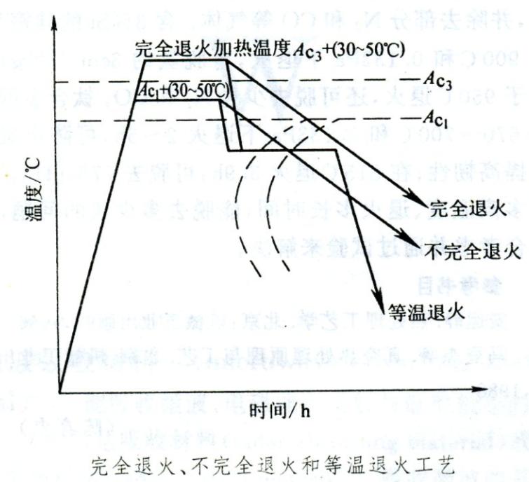 用鋼材制造的許多機器零部件(如軸、曲軸、齒輪、銷釘、絲桿等)和經過鍛造后的毛坯要進行正火或退火處理,以消除鍛坯中的粗大網狀組織或魏氏組織。退火工藝有幾種,對于亞共析鋼中的低碳和中碳鋼,常采用完全退火或不完全退火,二者只是加熱溫度不相同,目的一致。不完全退火適用于組織不十分粗大且要求不高的制件。也可以用等溫退火取代上述兩種退火工藝。圖示為完全退火、不完全退火和等溫退火工藝曲線與TTT曲線相互關系的示意圖。等溫退火是完全退火和不完全退火的特殊形式。