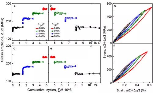 圖1. 納米孿晶Cu與歷史無關的穩定循環響應行為。在變幅疲勞實驗中, 具有不同孿晶片層和晶粒尺寸的兩類納米孿晶樣品隨塑性應變幅階梯式遞進增加時的循環響應曲線(圖a和d)和隨塑性應變幅階梯式遞進減小時的循環響應曲線(圖b和e);圖c和f分別為兩類樣品在不同應變幅時的滯后環。應變幅恒定時,應力和應變具有一一對應關系,循環滯后環完全重合。