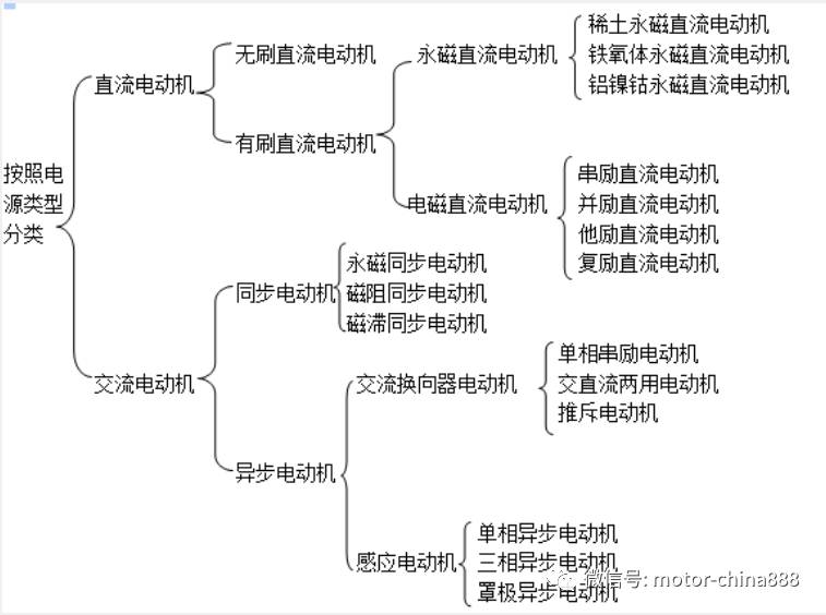 電動機按工作電源種類劃分:可分為直流電機和交流電機。直流電動機按結(jié)構(gòu)及工作原理可劃分:無刷直流電動機和有刷直流電動機。有刷直流電動機可劃分:永磁直流電動機和電磁直流電動機。電磁直流電動機劃分:串勵直流電動機、并勵直流電動機、他勵直流電動機和復勵直流電動機。永磁直流電動機劃分:稀土永磁直流電動機、鐵氧體永磁直流電動機和鋁鎳鈷永磁直流電動機。其中交流電機還可分:同步電機和異步電機。同步電機可劃分:永磁同步電動機、磁阻同步電動機和磁滯同步電動機。異步電機可劃分:感應電動機和交流換向器電動機。感應電動機可劃分:三相異步電動機、單相異步電動機和罩極異步電動機等。交流換向器電動機可劃分:單相串勵電動機、交直流兩用電動機和推斥電動機。