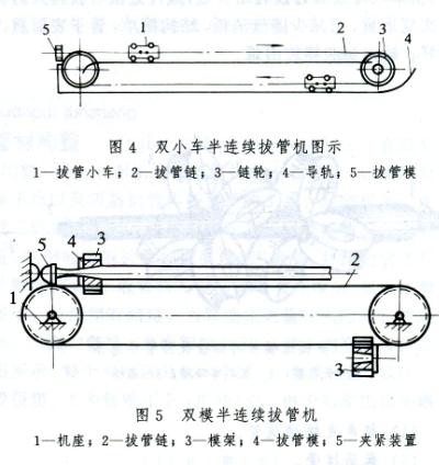 (2)半連續(xù)和連續(xù)拔管。各種直線式拔管機都是間歇工作的,拔完一根管后需等待小車返回才能拔下一根管。因此研究出半連續(xù)和連續(xù)式拔管。半連續(xù)冷拔管有兩種形式。一種是采用雙移動拔管小車(圖4),拔管小車固定在運動鏈上,并沿具有一定形狀的導軌運行。上層的拔管小車把前一根管子拔出后,下層的拔管小車到達中心架前并夾住后一根管進行拔制。另一種是拔制時移動雙拔管模的半連續(xù)拔管機,如圖5所示。