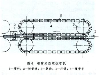 連續(xù)式拔管機有履帶式的(圖6)和雙小車往復運動式的。履帶式拔管機由前端裝有拔管模的幾個機架組成。機架上下兩側(cè)都裝有環(huán)鏈,環(huán)鏈軸上裝著履帶節(jié),用來壓緊管子強迫送入拔管模。這種連續(xù)式拔管機可進行無芯棒和長芯棒拔制,與普通拔管機相比可提高產(chǎn)量3倍;存在的問題是在無芯棒拔制時易產(chǎn)生縱向壁厚不均,使用固定模阻力大、能耗高、產(chǎn)品表面質(zhì)量較差以及脫棒困難。此外還有雙小車往復運動的連續(xù)拔管,用于無芯棒拔制,見連焊連拔精密管。