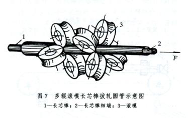 (3)長芯棒滾模拔制圓管工藝(圖7)。中國北京科技大學研究成功的多輥滾模長芯棒拔制圓管的過程是:拔制前先將管頭縮口,使之與芯棒錐形過渡區(qū)相配合以卡住管子。然后插入芯棒,且使長芯棒細端通過滾模。拔制時冷拔機鉗口咬住芯棒細端做直線運動,并將管子和芯棒一起從滾模中拉出,實現(xiàn)管材減壁延伸變形,變單純冷拔法為拔軋結(jié)合法。這種方法可獲得大的道次變形量,可減少能量消耗,結(jié)構(gòu)簡單,管子表面質(zhì)量好;缺點是脫棒較困難。