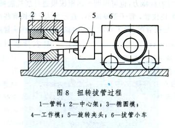 (9)扭轉(zhuǎn)拔管,即在拉拔的同時使管子產(chǎn)生扭轉(zhuǎn)的拔制過程。拔后的管子平直度好,可以省略矯直工序。拔制過程如圖8所示。管料1拔制時通過置于中心架2上的橢圓模3(用于防止管子轉(zhuǎn)動)和工作模4。借助于拔管小車6上的夾頭5的旋轉(zhuǎn)對出變形區(qū)后的管子施加扭矩,使它產(chǎn)生扭轉(zhuǎn),管子因扭轉(zhuǎn)而防止了彎曲。