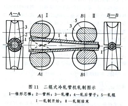二輥冷軋管機是廣泛應用的冷軋管機。優(yōu)點是道次變形量大,延伸系數(shù)可達到14~18;缺點是軋輥孔型制造困難,設備投資高,軋制管子尺寸精度不如多輥式冷軋管機。二輥式冷軋管機工作原理(見圖11)如同多輥式冷軋管機,其區(qū)別是:二輥冷軋管機用變斷面孔型的兩個軋輥,代替3~4個孔型斷面尺寸不變的輥子和使用錐形芯棒。