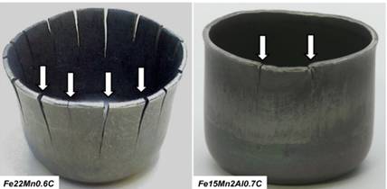 (右圖) TWIP鋼深沖件延遲開裂的抑制(Fe–22Mn–0.6C- 2.5%Al)