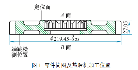 零件產(chǎn)量較大,采用串放式備料,其直徑大(219.2~219.45mm),壁厚較薄(27.05mm),且結(jié)構(gòu)為不完全對(duì)稱,即B端面?zhèn)葹橹睆叫〉膬?nèi)孔,而A端面?zhèn)葹橹睆酱蟮膬?nèi)花鍵,導(dǎo)致該類結(jié)構(gòu)零件兩端面(A和B端面)的熱變形存在趨勢(shì)不一致的特點(diǎn)。