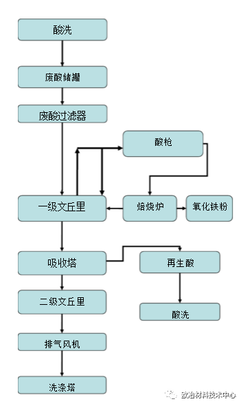 酸洗機組酸洗帶鋼產生的廢鹽酸,因富含氯化亞鐵而采用噴霧焙燒法進行再生處理,廢酸焙燒產生的含酸氣體經吸收塔吸收后形成再生酸,殘留的廢氣經洗滌塔洗滌后排入大氣。主要設備有廢酸儲罐、廢酸過濾器、文丘里、焙燒爐、吸收塔、風機、洗滌塔等。其工藝流程見圖3。